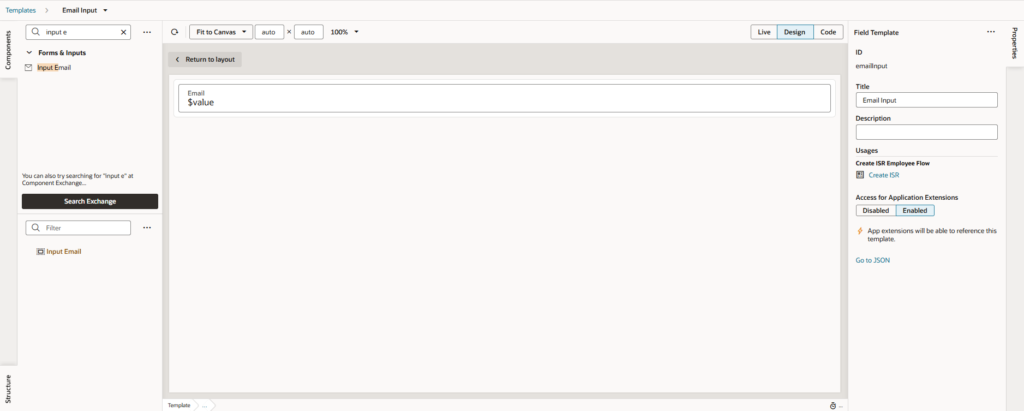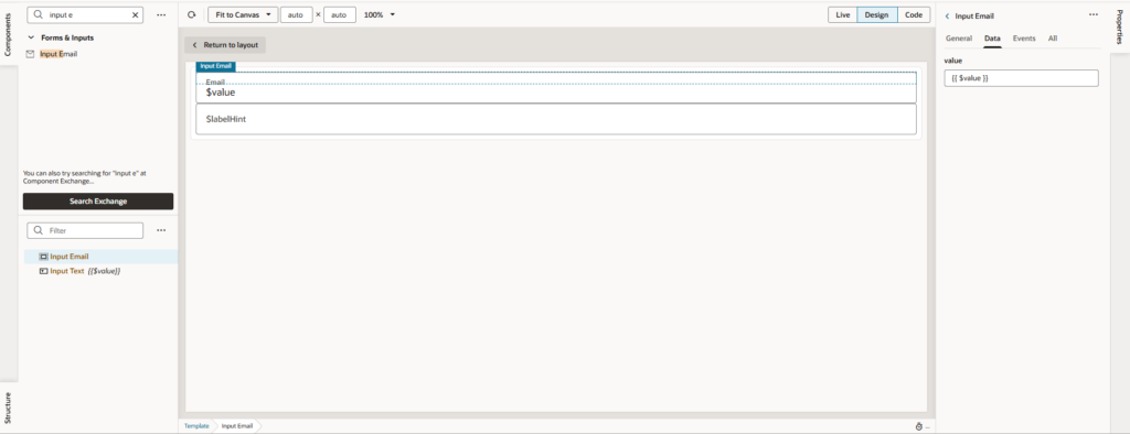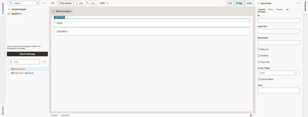 • In the template structure, add the appropriate component (e.g., Input Email for email fields).